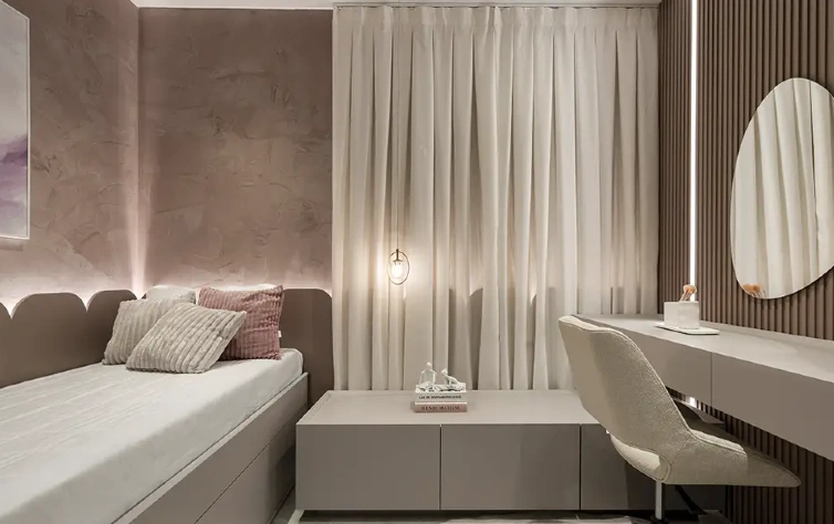 O dormitório planejado com linguagem delicada ou feminina trabalha cores suaves, iluminação acolhedora e detalhes decorativos bem dosados. Nichos, penteadeiras e iluminação indireta ajudam a compor o espaço de forma funcional e personalizada. O equilíbrio entre estética e praticidade permite que o quarto acompanhe mudanças de rotina e estilo ao longo do tempo, sem perder conforto ou organização.